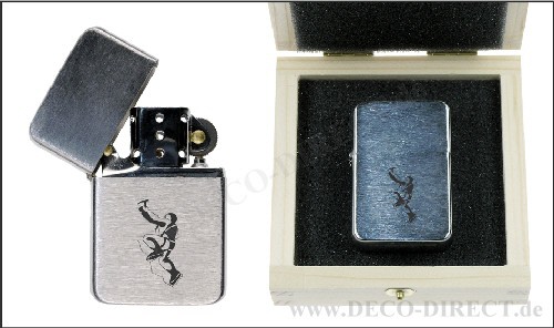 DECO DIRECT® Benzin-Feuerzeug Bergsteiger aus Metall mit gebürsteter Oberfläche, ca. 5,7 x 3,6 x 1,2 cm, nachfüllbar mit Feuerzeugbenzin (Lieferung aus Sicherheitsgründen ungefüllt), in Holzverpackung ...