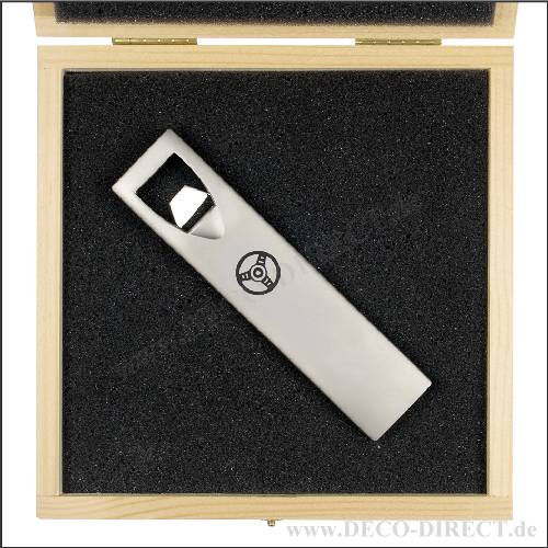 DECO DIRECT® Flaschenöffner Lenkrad aus Metall, 129 x 30 x 11 mm, in Holz-Geschenkverpackung (16,5 x 16,5 x 3,5 cm), Gravur-Empfehlung: auf Flaschenöffner / auf Verpackungsaußenseite, Bestellnummer: 58100930