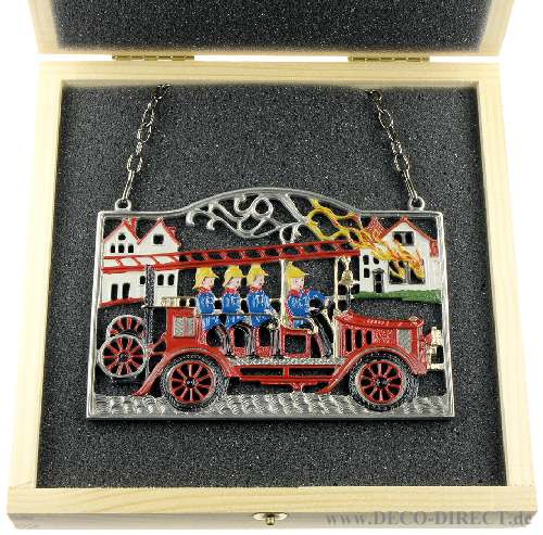 DECO DIRECT® Zinnbild Feuerwehrauto, H: 8,5 cm, in Holz-Geschenkverpackung (16,5 x 16,5 x 3,5 cm), Gravur-Empfehlung: auf Verpackungsaußenseite