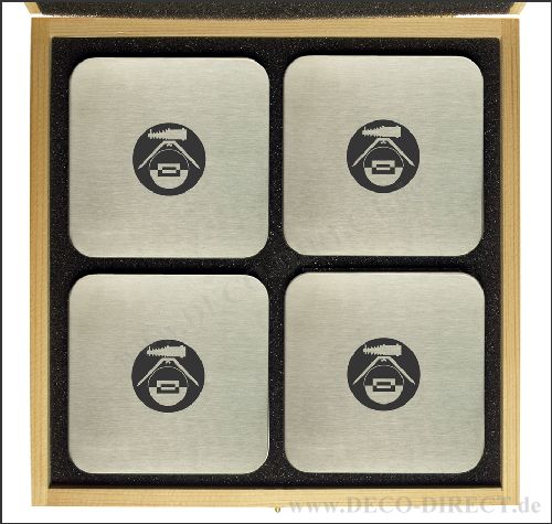 DECO DIRECT® 4er-Set Untersetzer Fotograf aus Edelstahl, quadratisch mit abgerundeten Ecken, jeweils 95 x 95 mm, in exklusiver Holz-Geschenkverpackung (22,5 x 22,5 x 3,5 cm), Gravurempfehlung: auf Untersetzer / auf Holz-Geschenkverpackung, Bestellnummer: 76150820