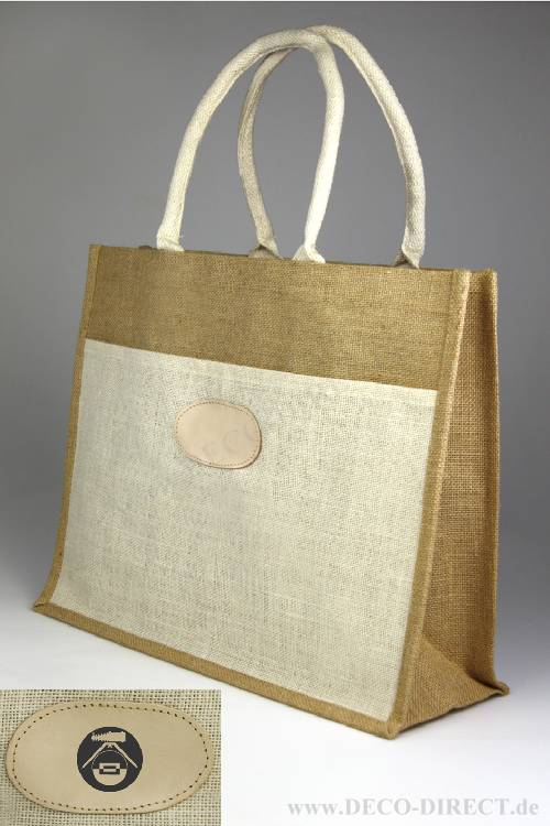 DECO DIRECT® Einkaufstasche Fotograf, 45 x 36 x 16 cm, natürliche Jute mit Innenbeschichtung, Baumwollhenkel und Fronttasche, Gravurempfehlung: Initialen auf Fronttasche, Bestellnummer: 83150850