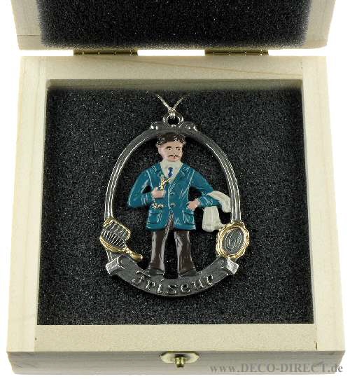 DECO DIRECT® Zinnfigur Friseur, H: 6,0 cm, inkl. Aufhänger, in Holz-Geschenkverpackung (9,5 x 9,5 x 3,5 cm), Gravur-Empfehlung: auf Verpackungsaußenseite, Bestellnummer: 13-20-058V
