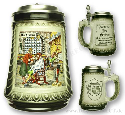 DECO DIRECT® Zunftseidel Der Friseur mit Zinndeckel, Zunftzeichen und Meisterspruch Meister ist wer was ersann, Geselle wer was kann, Lehrling jedermann, 0,5 l, aus Keramik grau/grün, Höhe ca. 17 cm, Gravurempfehlung: auf Zinndeckel, Bestellnummer: 74150910
