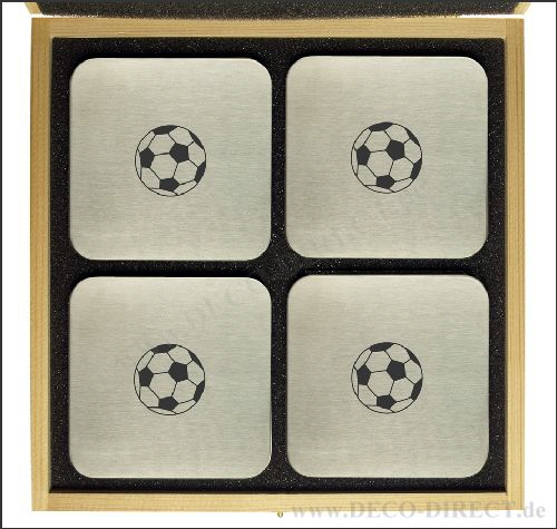 DECO DIRECT® 4er-Set Untersetzer Fußball aus Edelstahl, quadratisch mit abgerundeten Ecken, jeweils 95 x 95 mm, in exklusiver Holz-Geschenkverpackung (22,5 x 22,5 x 3,5 cm), Gravurempfehlung: auf Unte ...