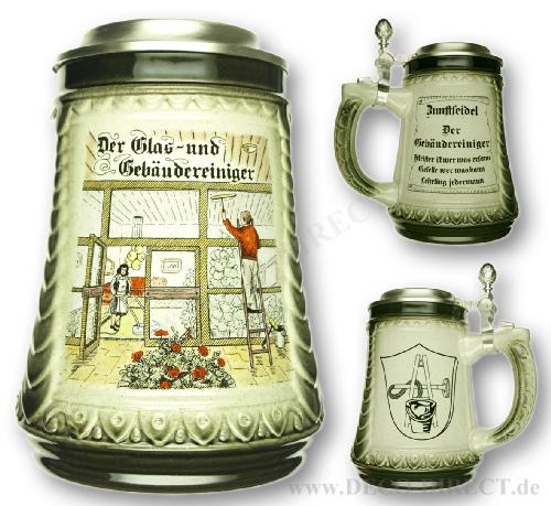 DECO DIRECT® Zunftseidel "Der Glas- und Gebäudereiniger" mit Zinndeckel, Zunftzeichen und Meisterspruch "Meister ist wer was ersann, Geselle wer was kann, Lehrling jedermann", 0,5 l, aus Keramik grau/grün, Höhe ca. 17 cm, Gravurempfehlung: auf Zinndeckel
