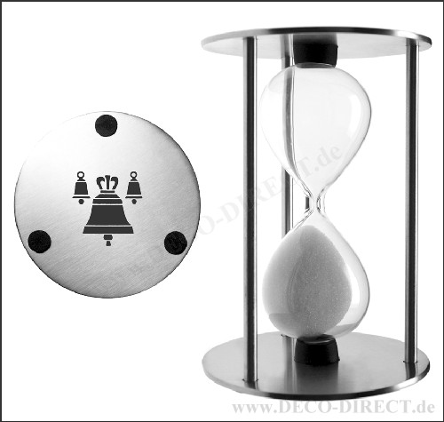 DECO DIRECT® Sanduhr Glockengießer aus Edelstahl, Laufzeit ca. 3 Minuten, Maße: 7,0 x 9,5 cm, in Metall-Geschenkbox (8,7 x 8,7 x 12,0 cm), Gravurempfehlung: auf Oberseite Sanduhr, Bestellnummer: 76161430