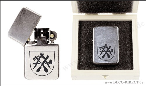 DECO DIRECT® Benzin-Feuerzeug Graveur aus Metall mit gebürsteter Oberfläche, ca. 5,7 x 3,6 x 1,2 cm, nachfüllbar mit Feuerzeugbenzin (Lieferung aus Sicherheitsgründen ungefüllt), in Holzverpackung (9, ...