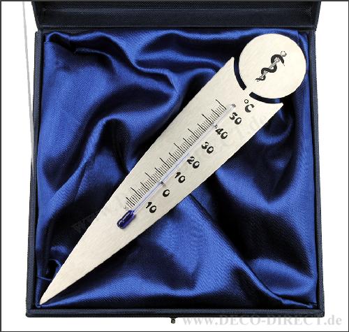 DECO DIRECT® Blumentopf-Thermometer Arzt aus Edelstahl, L: 21,5 cm, in blauer Etuiverpackung (17 x 17 x 3,5 cm) mit Stoffeinlage, zusätzl. Gravur-Empfehlung: Schild auf Verpackung, Bestellnummer: 13100650