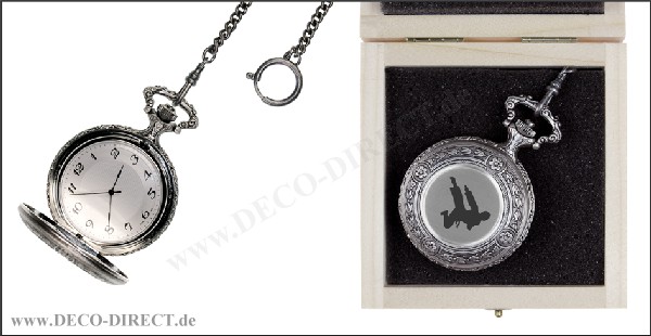 DECO DIRECT® Taschenuhr Karatekämpfer, antik versilbert, Ø ca. 48 mm, Handaufzug, arabisches Zifferblatt, Sprungdeckel und Kette, in Holzverpackung (9,5 x 9,5 x 3,5 cm), Gravurempfehlung: auf Verpackungsaußenseite, Bestellnummer: 82202230