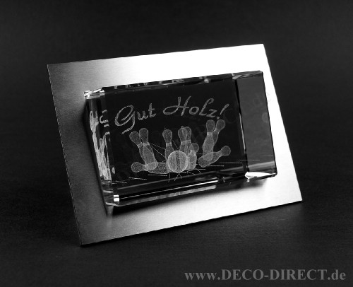 DECO DIRECT® 3D-Glasobjekt Bowling - Gut Holz!, 50 x 50 x 80 mm, in Edelstahlrahmen (80 x 110 mm), Gravur-Empfehlung: auf Edelstahlrahmen, Bestellnummer: 91200501