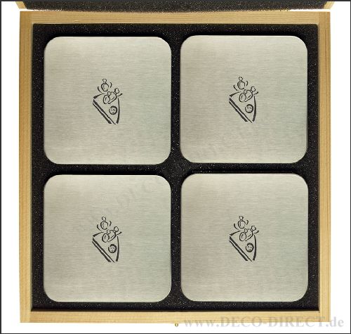 DECO DIRECT® 4er-Set Untersetzer Kegeln aus Edelstahl, quadratisch mit abgerundeten Ecken, jeweils 95 x 95 mm, in exklusiver Holz-Geschenkverpackung (22,5 x 22,5 x 3,5 cm), Gravurempfehlung: auf Untersetzer / auf Holz-Geschenkverpackung, Bestellnummer: 76200520