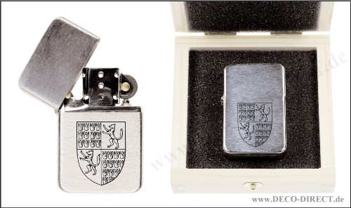 DECO DIRECT® Benzin-Feuerzeug Kürschner 1 aus Metall mit gebürsteter Oberfläche, ca. 5,7 x 3,6 x 1,2 cm, nachfüllbar mit Feuerzeugbenzin (Lieferung aus Sicherheitsgründen ungefüllt), in Holzverpackung (9,5 x 9,5 x 3,5 cm), Gravurempfehlung: auf Verpackung, Bestellnummer: 72202170