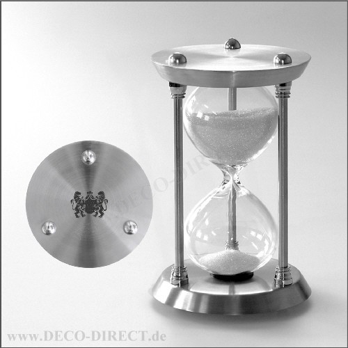DECO DIRECT® Sanduhr Kürschner 3 aus Edelstahl, Ø 10,5 cm, H: 17 cm, Laufzeit ca. 15 min., Glas mundgeblasen, feiner Glassand, Gravurempfehlung: auf Sanduhr, Bestellnummer: 38202110