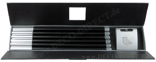 DECO DIRECT® Schreibset Kasse, 6 Bleistifte mit Metallkappe und Design-Anspitzer mit dezent eingraviertem Symbol, in exklusiver Karton-Geschenkverpackung (26 x 5,5 x 2,5 cm), Gravurempfehlung: Namensgravur auf Bleistifte / Text auf Verpackungsaußenseite, Bestellnummer: 62202410