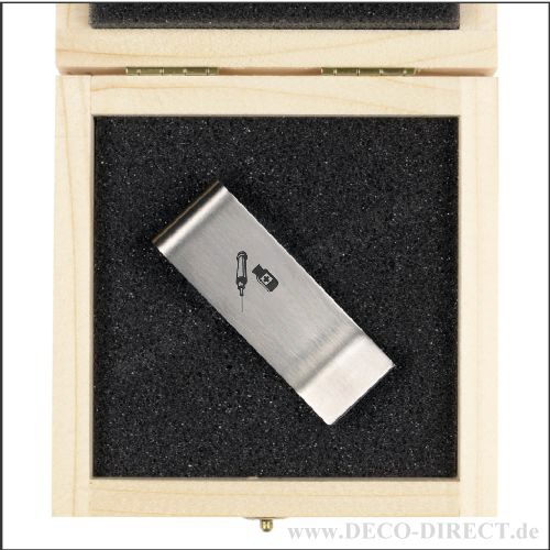 DECO DIRECT® Geldscheinklammer Medizin aus Edelstahl, 57 x 20 x 9 mm, in Holz-Geschenkverpackung (9,5 x 9,5 x 3,5 cm), Gravurempfehlung: Initialen auf Geldscheinklammer / Text auf Verpackungsaußenseit ...