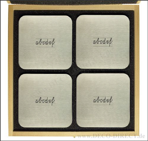 DECO DIRECT® 4er-Set Untersetzer Schule aus Edelstahl, quadratisch mit abgerundeten Ecken, jeweils 95 x 95 mm, in exklusiver Holz-Geschenkverpackung (22,5 x 22,5 x 3,5 cm), Gravurempfehlung: auf Unter ...