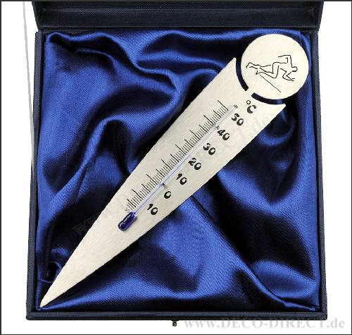 DECO DIRECT® Blumentopf-Thermometer Sprinter aus Edelstahl, L: 21,5 cm, in blauer Etuiverpackung (17 x 17 x 3,5 cm) mit Stoffeinlage, zusätzl. Gravur-Empfehlung: Schild auf Verpackung, Bestellnummer: ...