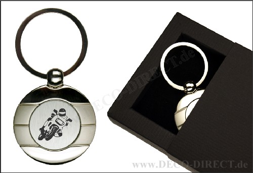 DECO DIRECT® Schlüsselanhänger rund Motorradfahrer aus Metall, L: ca. 7,5 cm, in exklusiver Geschenkverpackung, Gravurempfehlung: Schild auf Geschenkverpackung, Bestellnummer: 10221460