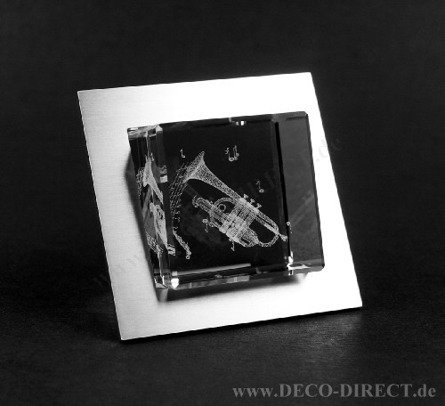 DECO DIRECT® 3D-Glasobjekt Trompete, 40 x 40 x 40 mm, in Edelstahlrahmen (64 x 64 mm), Gravur-Empfehlung: auf Edelstahlrahmen, Bestellnummer: 91221209