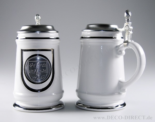 DECO DIRECT® Keramik-Bierseidel weiß Notenschlüssel mit Noten 0,5 l, mit Platindekor und Zinndeckel, H: ca. 19,3 cm, Gravur-Empfehlung: auf Deckeloberseite, Bestellnummer: 75221290