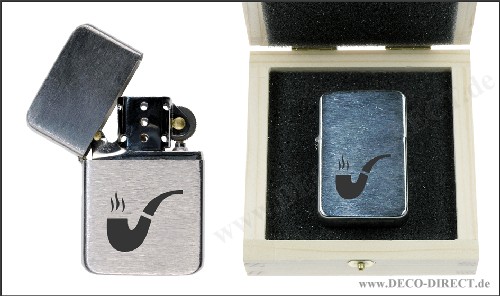 DECO DIRECT® Benzin-Feuerzeug Pfeife aus Metall mit gebürsteter Oberfläche, ca. 5,7 x 3,6 x 1,2 cm, nachfüllbar mit Feuerzeugbenzin (Lieferung aus Sicherheitsgründen ungefüllt), in Holzverpackung (9,5 x 9,5 x 3,5 cm), Gravurempfehlung: auf Verpackung, Bestellnummer: 72251070