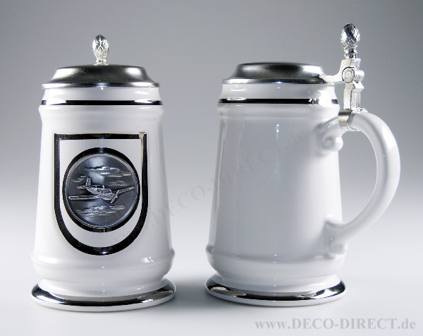 DECO DIRECT® Keramik-Bierseidel weiß Sportflugzeug 0,5 l, mit Platindekor und Zinndeckel, H: ca. 19,3 cm, Gravur-Empfehlung: auf Deckeloberseite, Bestellnummer: 75250490