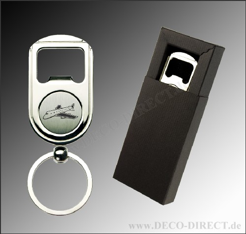 DECO DIRECT® Schlüsselanhänger Flugzeug aus Metall mit Flaschenöffner, L: ca. 9,8 cm, in exklusiver Geschenkverpackung, Gravurempfehlung: auf Schlüsselanhänger / Schild auf Geschenkverpackung, Bestellnummer: 10250450