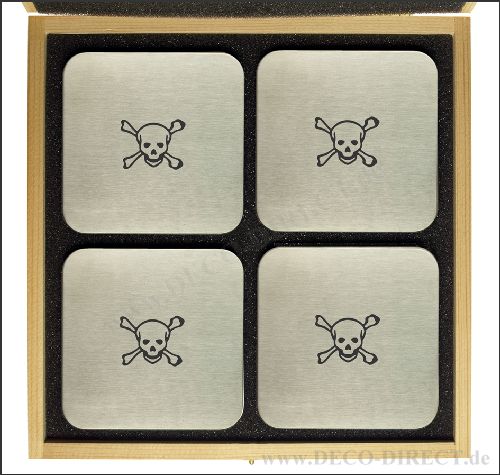 DECO DIRECT® 4er-Set Untersetzer Totenkopf aus Edelstahl, quadratisch mit abgerundeten Ecken, jeweils 95 x 95 mm, in exklusiver Holz-Geschenkverpackung (22,5 x 22,5 x 3,5 cm), Gravurempfehlung: auf Untersetzer / auf Holz-Geschenkverpackung, Bestellnummer: 76251120