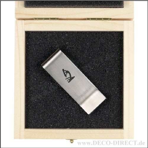 DECO DIRECT® Geldscheinklammer Mikroskop aus Edelstahl, 57 x 20 x 9 mm, in Holz-Geschenkverpackung (9,5 x 9,5 x 3,5 cm), Gravurempfehlung: Initialen auf Geldscheinklammer / Text auf Verpackungsaußense ...