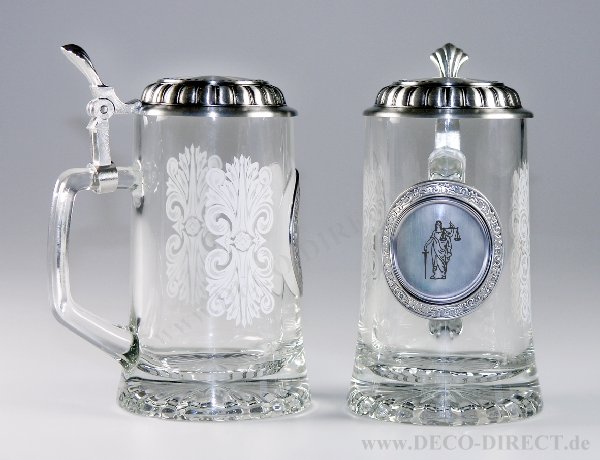 DECO DIRECT® Glas-Bierseidel Justitia 0,5 l, mit Zinndeckel und Sternboden, H: ca. 18,5 cm, Gravur-Empfehlung: auf Deckeloberseite, Bestellnummer: 75100372