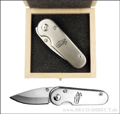 DECO DIRECT® Taschenmesser Justitia - kompaktes Ganzmetall-Messer aus rostfreiem Edelstahl, Gesamtlänge ausgeklappt: ca. 13,6 cm, Stahlklinge, mit Gürtelclip, in Holzverpackung (9,5 x 9,5 x 3,5 cm), Gravurempfehlung: auf Messer / auf Verpackung, Bestellnummer: 79100321