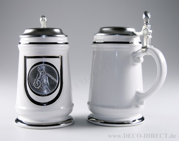 DECO DIRECT® Keramik-Bierseidel weiß Pferdekopf 0,5 l, mit Platindekor und Zinndeckel, H: ca. 19,3 cm, Gravur-Empfehlung: auf Deckeloberseite, Bestellnummer: 75270790