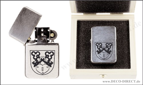 DECO DIRECT® Benzin-Feuerzeug Schlosser aus Metall mit gebürsteter Oberfläche, ca. 5,7 x 3,6 x 1,2 cm, nachfüllbar mit Feuerzeugbenzin (Lieferung aus Sicherheitsgründen ungefüllt), in Holzverpackung (9,5 x 9,5 x 3,5 cm), Gravurempfehlung: auf Verpackung, Bestellnummer: 72280870
