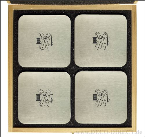 DECO DIRECT® 4er-Set Untersetzer Schneider aus Edelstahl, quadratisch mit abgerundeten Ecken, jeweils 95 x 95 mm, in exklusiver Holz-Geschenkverpackung (22,5 x 22,5 x 3,5 cm), Gravurempfehlung: auf Untersetzer / auf Holz-Geschenkverpackung, Bestellnummer: 76281120