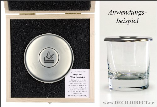 DECO DIRECT® Trinkglasdeckel Schreiner 2 aus Edelstahl, Ø 9,5 cm, in Holz-Geschenkverpackung (16,5 x 16,5 x 3,5 cm), Gravurempfehlung: Rundgravur auf Trinkglasdeckel / auf Verpackungsaußenseite, Bestellnummer: 29281211