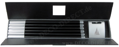 DECO DIRECT® Schreibset Segelschiff, 6 Bleistifte mit Metallkappe und Design-Anspitzer mit dezent eingraviertem Symbol, in exklusiver Karton-Geschenkverpackung (26 x 5,5 x 2,5 cm), Gravurempfehlung: Namensgravur auf Bleistifte / Text auf Verpackungsaußenseite, Bestellnummer: 62281910