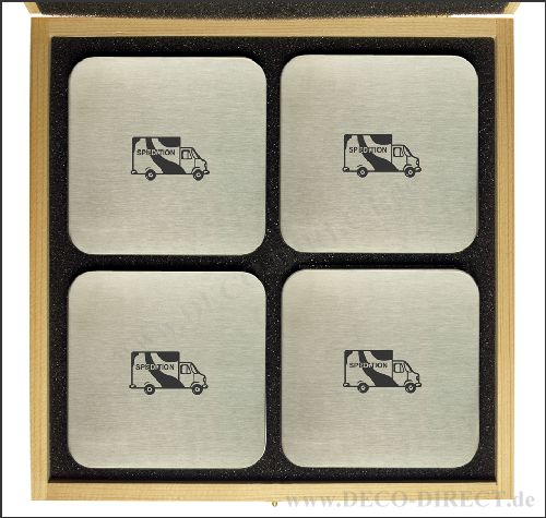 DECO DIRECT® 4er-Set Untersetzer Spedition aus Edelstahl, quadratisch mit abgerundeten Ecken, jeweils 95 x 95 mm, in exklusiver Holz-Geschenkverpackung (22,5 x 22,5 x 3,5 cm), Gravurempfehlung: auf Untersetzer / auf Holz-Geschenkverpackung, Bestellnummer: 76282220