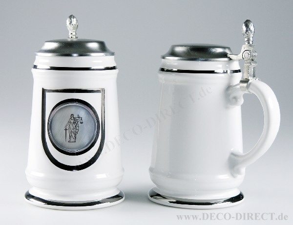 DECO DIRECT® Keramik-Bierseidel weiß Justitia 0,5 l, mit Platindekor und Zinndeckel, H: ca. 19,3 cm, Gravur-Empfehlung: auf Deckeloberseite, Bestellnummer: 75100392