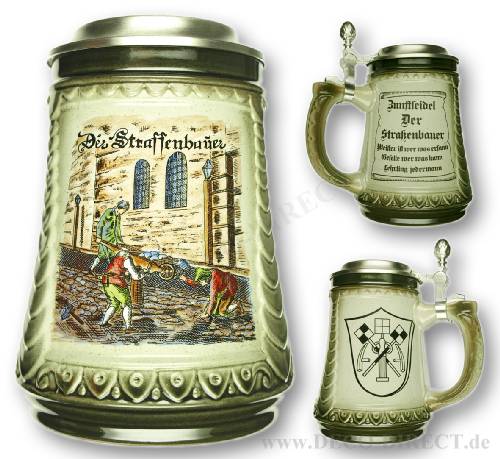 DECO DIRECT® Zunftseidel Der Strassenbauer mit Zinndeckel, Zunftzeichen und Meisterspruch Meister ist wer was ersann, Geselle wer was kann, Lehrling jedermann, 0,5 l, aus Keramik grau/grün, Höhe ca. 17 cm, Gravurempfehlung: auf Zinndeckel, Bestellnummer: 74282910