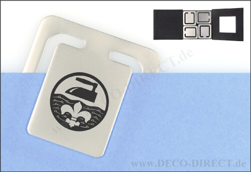 DECO DIRECT® 4er-Set Lesezeichen Wäscherei - Büglerei aus Metall, je 43 x 38 mm, in exklusiver Karton-Geschenkverpackung, Gravurempfehlung: Initialen auf Lesezeichen / Schild auf Verpackungsaußenseite ...