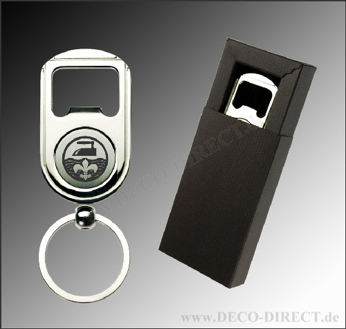 DECO DIRECT® Schlüsselanhänger Wäscherei - Büglerei aus Metall mit Flaschenöffner, L: ca. 9,8 cm, in exklusiver Geschenkverpackung, Gravurempfehlung: auf Schlüsselanhänger / Schild auf Geschenkverpack ...