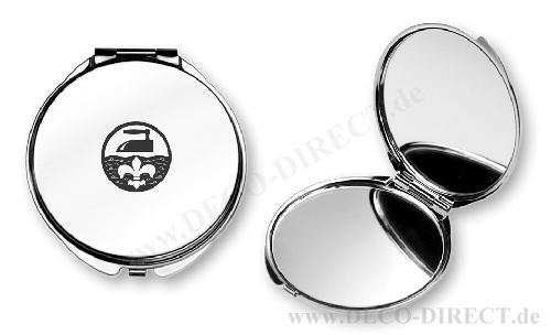 DECO DIRECT® Schminkspiegel Wäscherei - Büglerei, Ø 6 cm, H: 0,5 cm aus Metall, in Geschenkverpackung, Gravur-Empfehlung: Namensgravur auf Schminkspiegel / Schild auf Geschenkverpackung, Bestellnummer: 83320940
