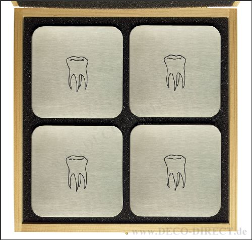 DECO DIRECT® 4er-Set Untersetzer Zahn aus Edelstahl, quadratisch mit abgerundeten Ecken, jeweils 95 x 95 mm, in exklusiver Holz-Geschenkverpackung (22,5 x 22,5 x 3,5 cm), Gravurempfehlung: auf Untersetzer / auf Holz-Geschenkverpackung, Bestellnummer: 76350120
