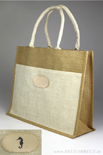 DECO DIRECT® Einkaufstasche Seepferdchen, 45 x 36 x 16 cm, natürliche Jute mit Innenbeschichtung, Baumwollhenkel und Fronttasche, Gravurempfehlung: Initialen auf Fronttasche, Bestellnummer: 83350650