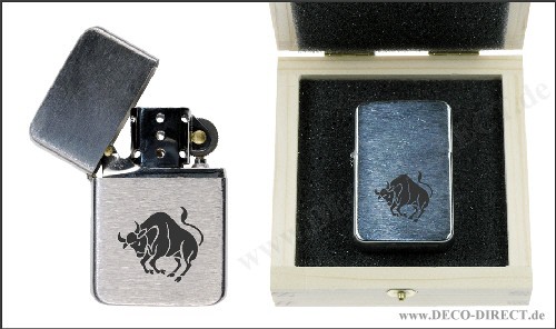 DECO DIRECT® Benzin-Feuerzeug Stier aus Metall mit gebürsteter Oberfläche, ca. 5,7 x 3,6 x 1,2 cm, nachfüllbar mit Feuerzeugbenzin (Lieferung aus Sicherheitsgründen ungefüllt), in Holzverpackung (9,5 ...