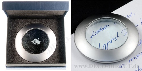 DECO DIRECT® Briefbeschwerer Stier mit Lupe und Chrom-Rand, Ø 8,5 cm, in exklusiver Geschenkverpackung, Gravurempfehlung: auf Briefbeschwerer / Schild auf Geschenkverpackung, Bestellnummer: 72900510