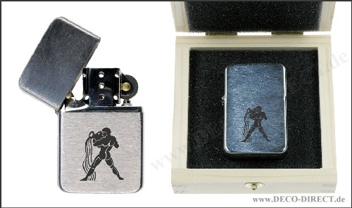 DECO DIRECT® Benzin-Feuerzeug Wassermann aus Metall mit gebürsteter Oberfläche, ca. 5,7 x 3,6 x 1,2 cm, nachfüllbar mit Feuerzeugbenzin (Lieferung aus Sicherheitsgründen ungefüllt), in Holzverpackung ...