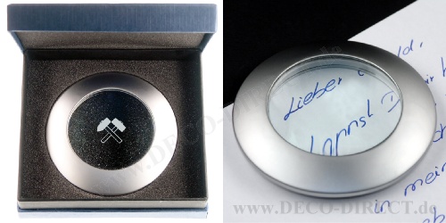 DECO DIRECT® Briefbeschwerer Bergarbeiter mit Lupe und Chrom-Rand, Ø 8,5 cm, in exklusiver Geschenkverpackung, Gravurempfehlung: auf Briefbeschwerer / Schild auf Geschenkverpackung, Bestellnummer: 72110810