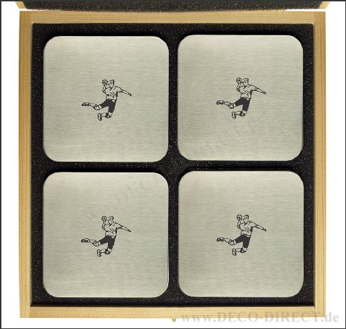 DECO DIRECT® 4er-Set Untersetzer Handball aus Edelstahl, quadratisch mit abgerundeten Ecken, jeweils 95 x 95 mm, in exklusiver Holz-Geschenkverpackung (22,5 x 22,5 x 3,5 cm), Gravurempfehlung: auf Untersetzer / auf Holz-Geschenkverpackung, Bestellnummer: 76170120