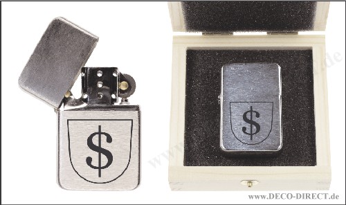 DECO DIRECT® Benzin-Feuerzeug Dollar aus Metall mit gebürsteter Oberfläche, ca. 5,7 x 3,6 x 1,2 cm, nachfüllbar mit Feuerzeugbenzin (Lieferung aus Sicherheitsgründen ungefüllt), in Holzverpackung (9,5 x 9,5 x 3,5 cm), Gravurempfehlung: auf Verpackung, Bestellnummer: 72110570